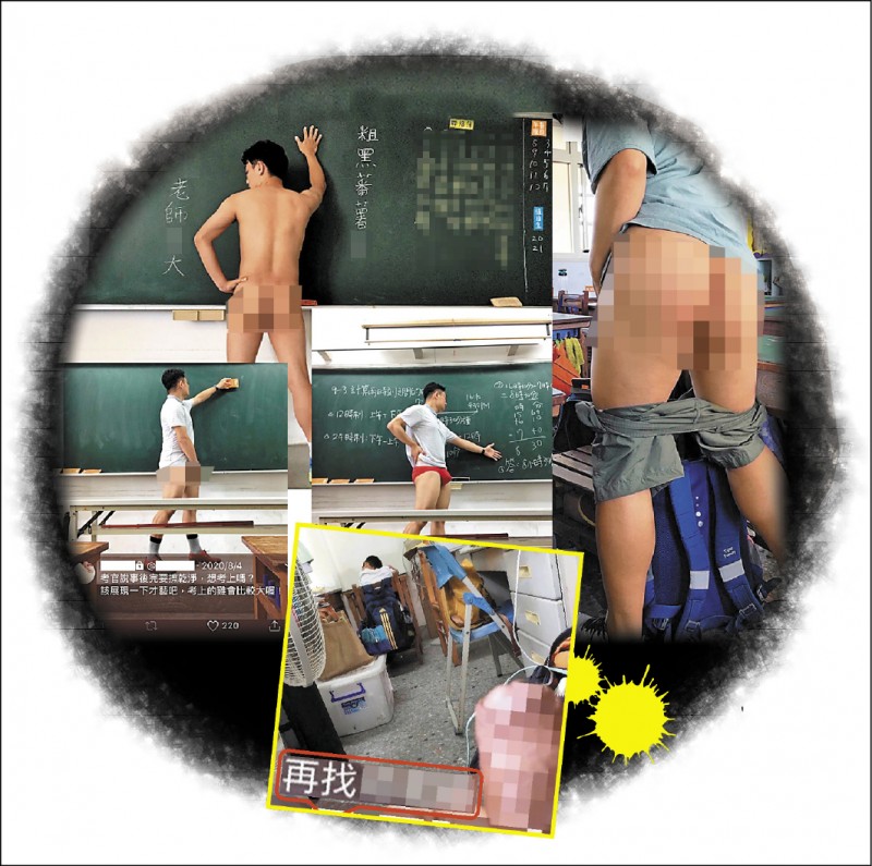 台中市某國小代課老師兼班導,在教室露鳥自拍、PO網,甚至出現學童趴在課桌睡覺,該班導在後裸體自拍(小圖)。(圖:林祈烽提供)