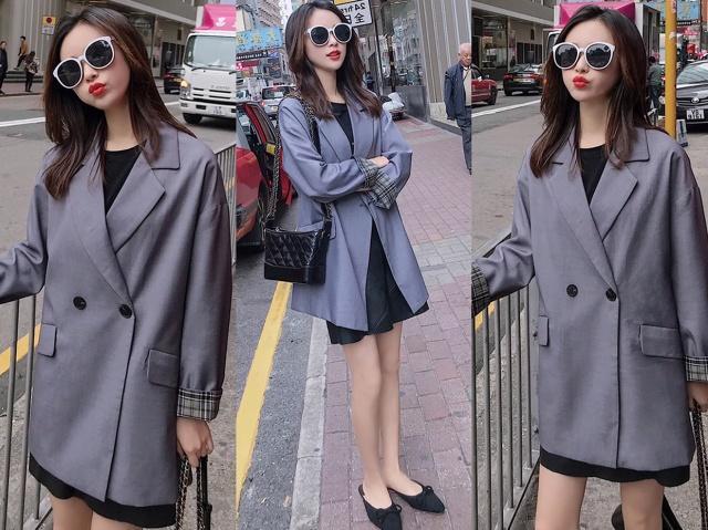 1、很帥氣的灰色西裝,比較寬鬆的大碼版型,穿上身很能遮掩腰粗的缺點,氣質的翻領,襯托出更美的臉型,兩側的口袋,更是經典又好看,搭配短裙超級顯腿長的,西裝的扣子可以繫上,也可以敞開,十分隨性,再外搭一對尖頭平底鞋,時尚又很美。