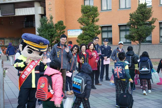 警察公仔早上7點和鎮長康世明、鎮代表會主席與多名縣議員,在竹南鎮山佳國小校門口向學童宣導安全重要性。(黎薇翻攝)