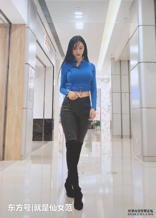 穿了一款緊湊的黑色皮褲,與過膝的黑色長靴結合起來。一下就映襯出一雙筆直、修長的美腿。瘦、高的形象,與皮褲的美非常恰合,盡顯女人的大長腿優勢。